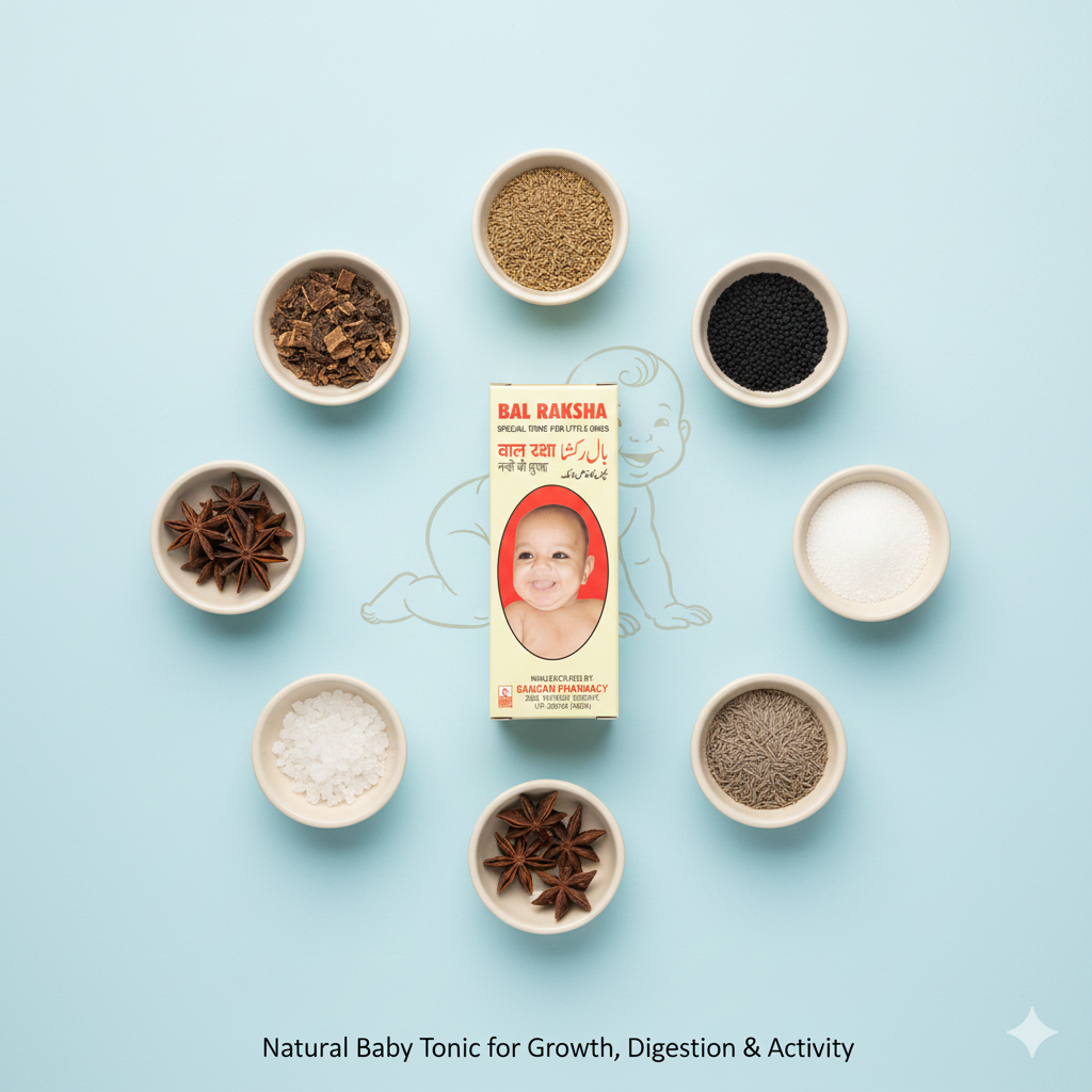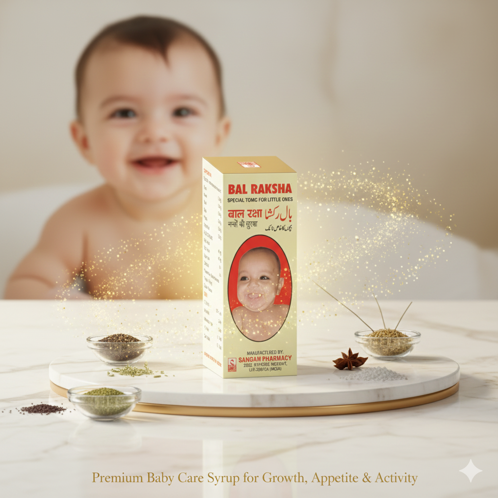 Bal Raksha is a trusted baby health care syrup formulated to support healthy growth, improve appetite, and relieve common digestive troubles in infants and young children. It is especially beneficial for babies experiencing flatulence, constipation, general weakness, or teething discomfort, helping them stay active, energetic, and happy.