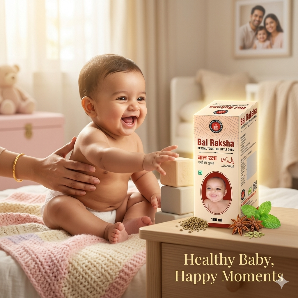 Bal Raksha is a trusted baby health care syrup formulated to support healthy growth, improve appetite, and relieve common digestive troubles in infants and young children. It is especially beneficial for babies experiencing flatulence, constipation, general weakness, or teething discomfort, helping them stay active, energetic, and happy.