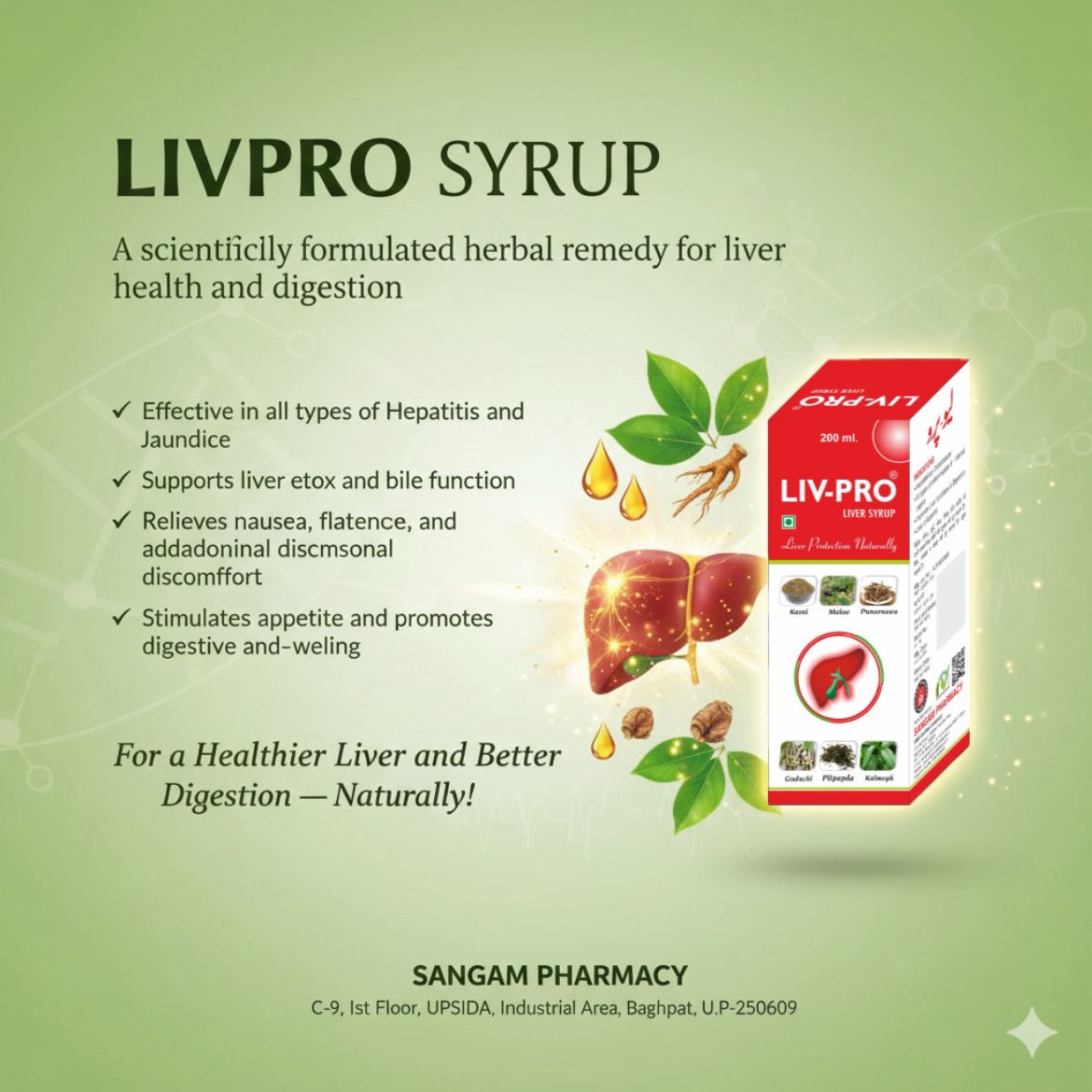 Livpro syrup is a scientifically formulated blend of carefully selected herbs, serving as an exceptional remedy for a range of liver-related issues. This herbal medicine is highly effective in treating all types of hepatitis, jaundice, cholecystitis, chronic liver disorders, constipation, flatulence, nausea, and spasmodic abdominal pain. In addition, Livpro syrup stimulates appetite and gastrointestinal functions, promoting overall digestive health.